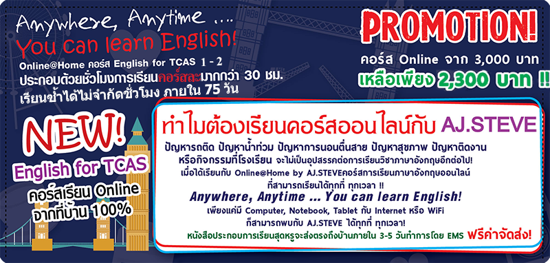 - ปัญหารถติด ปัญหาน้ำท่วม ปัญหาการนอนตื่นสาย ปัญหาสุขภาพ ปัญหาติดงานหรือกิจกรรมที่โรงเรียน จะไม่เป็นอุปสรรคต่อการเรียนวิชาภาษาอังกฤษอีกต่อไป! เมื่อได้เรียนกับ Online@Home by AJ.STEVE คอร์สการเรียนภาษาอังกฤษออนไลน์ที่สามารถเรียนได้ทุกที่ ทุกเวลา !! Anywhere, Anytime … You can learn English!